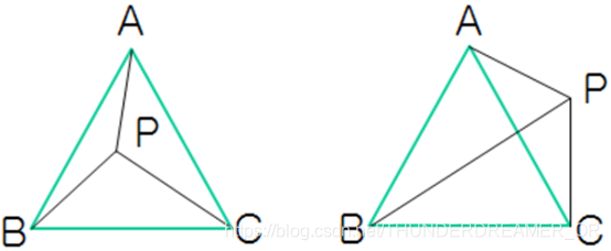 解法1:面积法,如果P在三角形内,那么由P与其他三个点构造的三个三角形的面积之和等于原来三角形的面积,如在三角形外部,则其面积之和肯定大于原三角形面积。