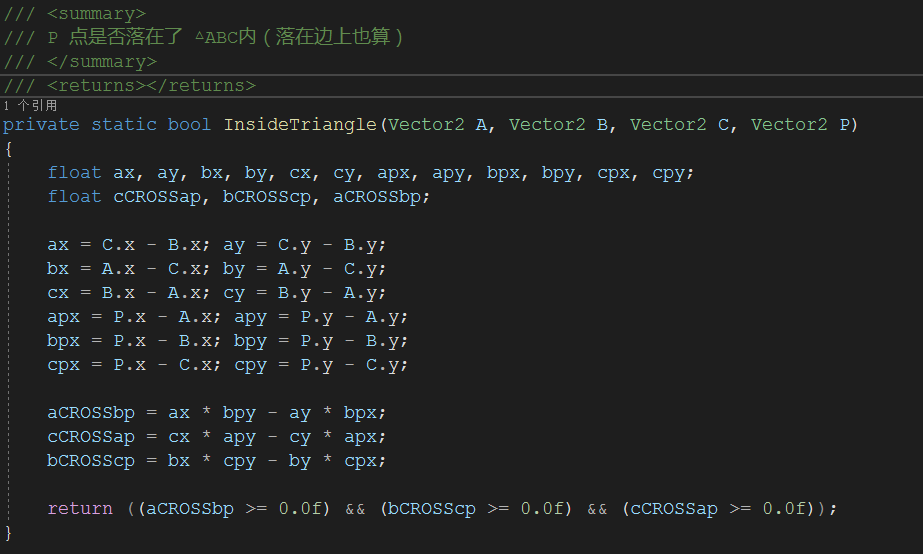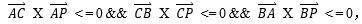 解法3:同侧法,即不管顺时针方向还是你是正方向,以其中一个点为起点到下一个点的过程中,如果点P始终在该边的同一侧(左或右),即P点在内部,否则在外部。那么又要用到向量的叉乘。如果选择顺时针方向,即A -> C -> B,