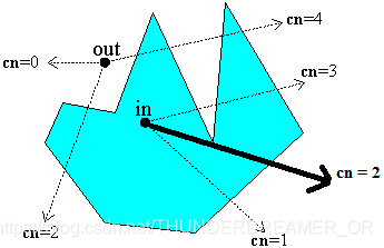解法4:射线法,在点P处发射沿任意方向(一般计算的时候水平的方向)的射线,该射线跟多边形的交点个数为奇数,则P点在内部,反之在外部。但是也有一定的问题,如下图,其中那条粗线指出了该方法的问题,当这条射线正好跟多边形的一个顶点相交。对于这种情况,在计算之前判断该点是否落在要选定的射线方向上,如果在,排除该点不计,否则进入下一步计算判断。
