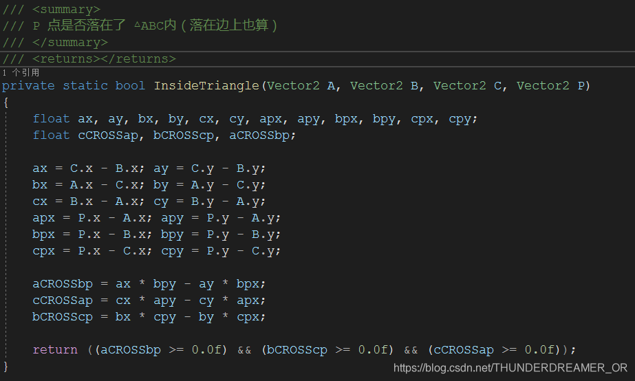 的值小于0。其实对这两个向量叉乘的结果取绝对值,得到的结果是这个三角形的面积。