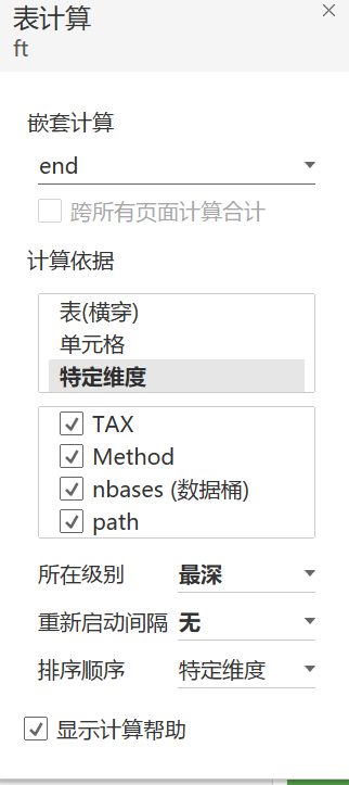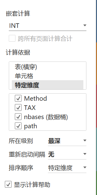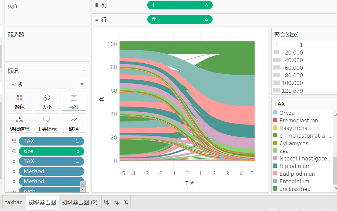 我们说了x不需要过大、[-5,-5]够了,便于修理设定到[-6,-6]:创建字段t,公式(index()-25)/4,计算的依据是path(意思就是index([path]))。创建字段logstic,公式1/(1+EXP(1)^-[t])。设定曲线左端高度:创建int字段,公式100*RUNNING_SUM(sum([numSeqs]))/TOTAL(sum([numSeqs]));创建end字段100*RUNNING_SUM(sum([numSeqs]))/TOTAL(sum([numSeqs]))。这两有啥不一样呢?计算依据不同。int计算依据是method,tax,path;end是tax,method,path。两个都在是分类依据,类别数跟顺序无关,类别和顺序有关、谁在前分类就按谁来。这和excel的排序处理很类似,都是且的关系,谁在前、主要分类依据就是谁。一会图建好了右键再看下数据就更清楚了。细心的朋友发现了终点其实不是终点,终点应该减去起点那个截距,所以最终曲线函数:创建字段ft,公式[INT]+([end]-[INT])*[logistic]。大小写不要纠结,你保持一致就好,我懒得改。现在把ft拉倒行去,右键编辑计算表,设置如下:
