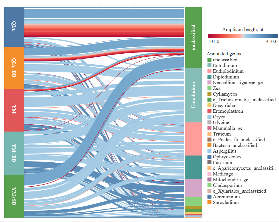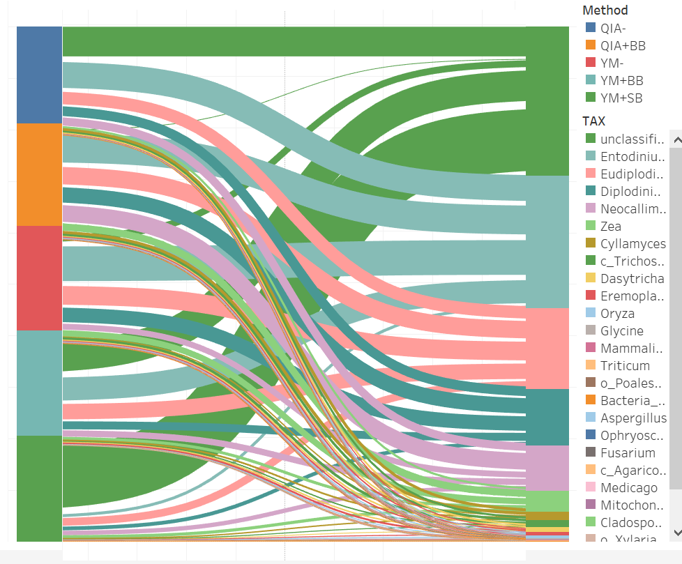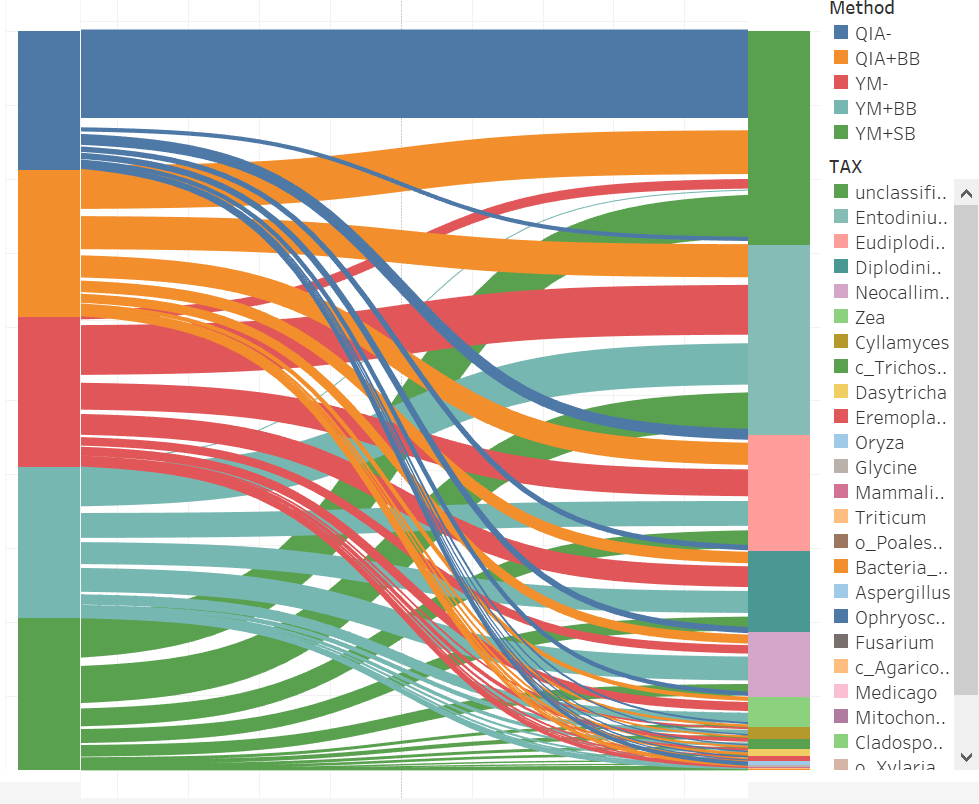 由2个堆叠柱形图,一个logistic曲线构成。曲线的起点连接method、终点连接tax,宽度表示这部分序列占总序列的比例。从左柱形图往右柱形图看就是说明每种方法得到序列都是被注释成了什么、且可以看出比例是多少;倒过来看就是某种物种都是来自于哪些方法得到的序列、也可以看出比例是多少。