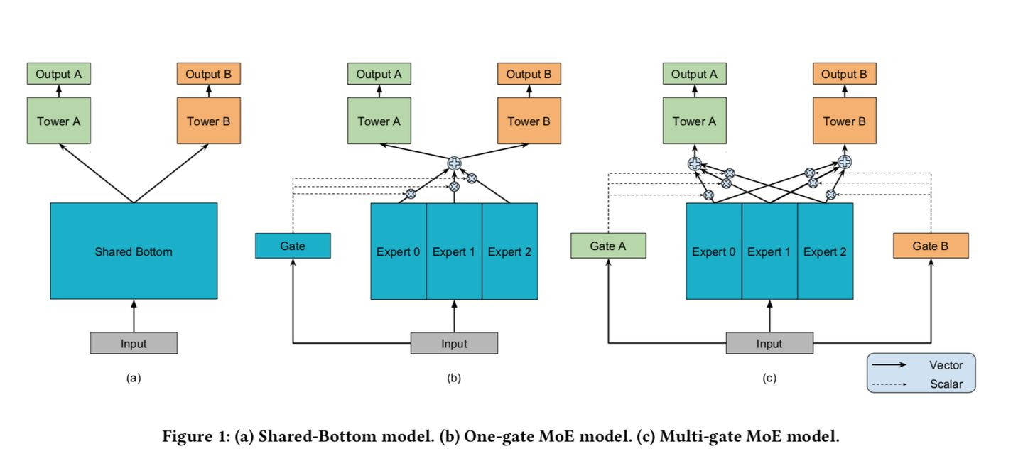 一个softmax层,输出是一个相比于shared-bottom结构,MoE网络中,每个Expert网络规模很小,MoE网络的参数量和shared-botton结构的参数量相当。而且多个task共享MoE层,所以任务增加并不会增加MoE层的参数,只是上层的task-specific层增加了一个tower。