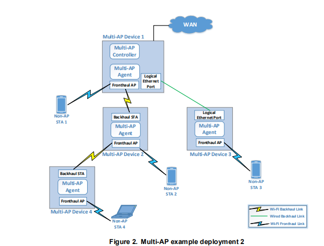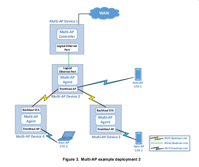 A STA on a Multi-AP device with a Multi-AP Agent that provides Wi-Fi connectivity with other Wi-Fi access points over the backhaul link. 可以通过无线连接到Wi-Fi AP点,并建立backhaul link的客户端 |