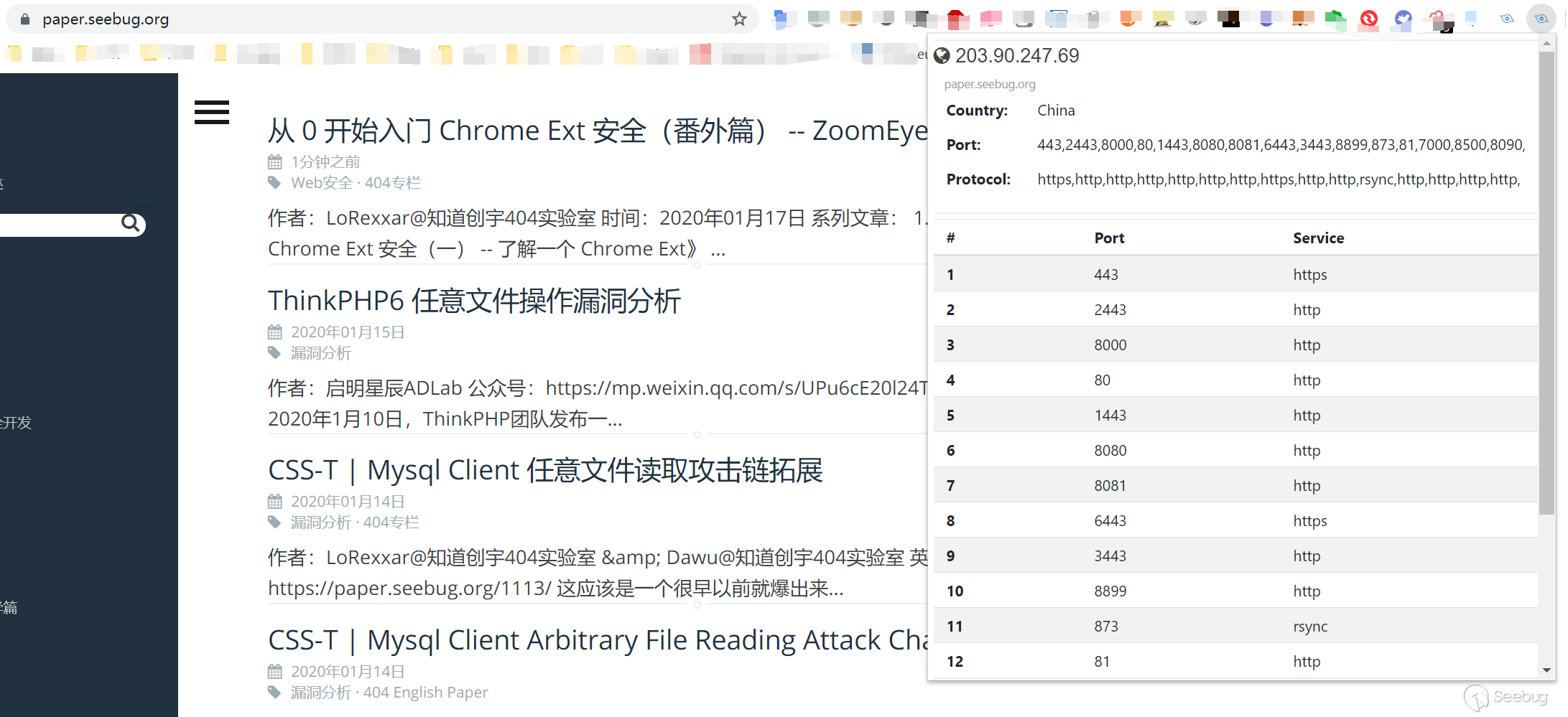 在访问网页时,点击右上角的插件图标,我们就能看到相关ip的信息以及开放端口