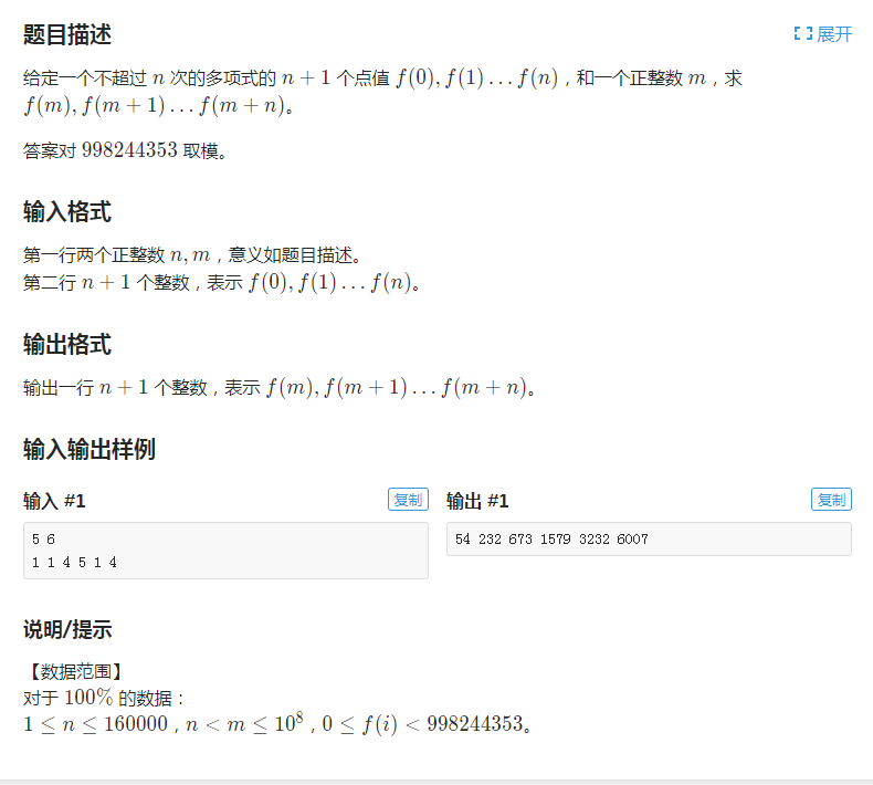乍一看很简单,给你n+1个点值,求一个n次多项式,并求出从m开始的n个点值。