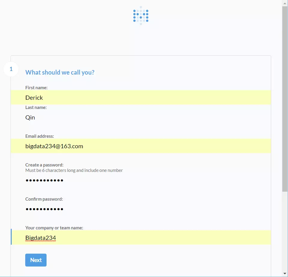配置管理员的基本信息,需要填入选项有:姓名,Email,登陆密码,公司名称,具体如下图所示: