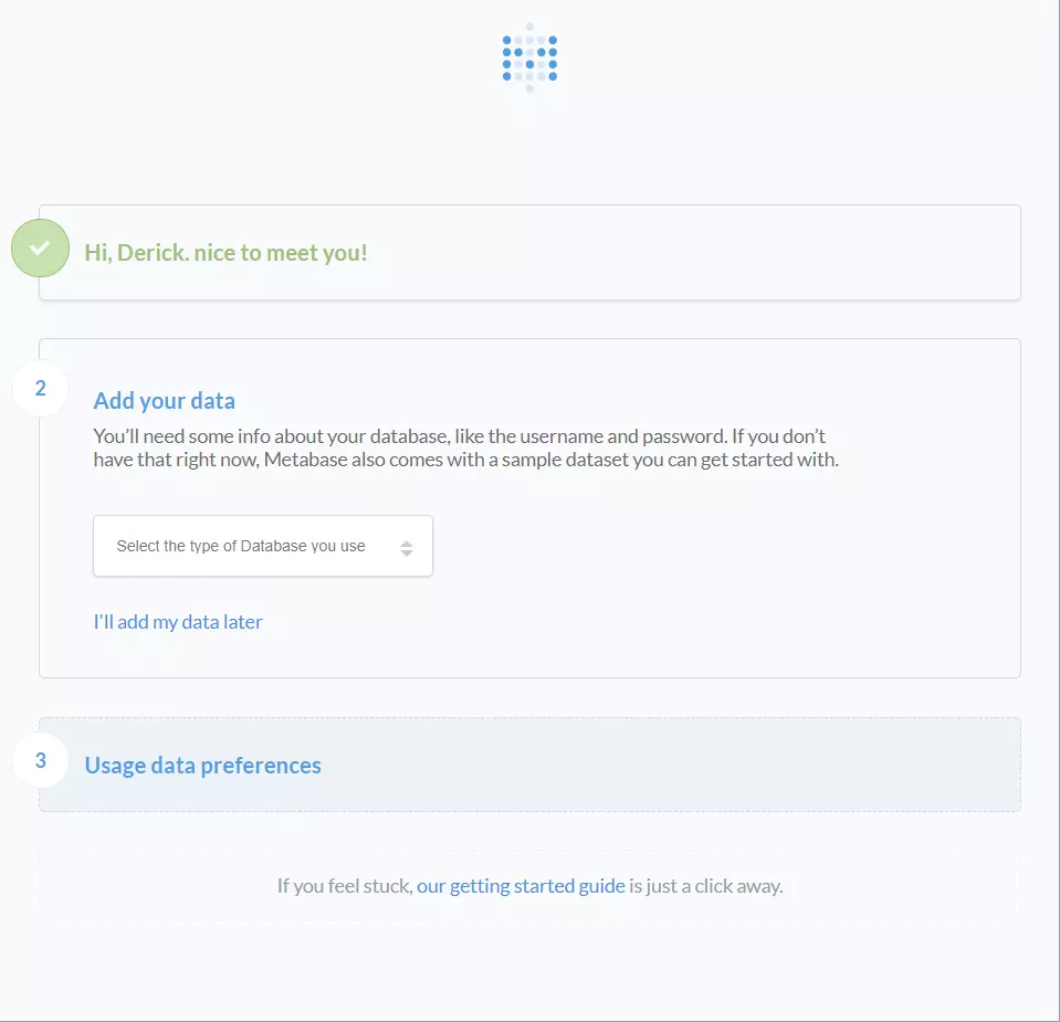 完成了管理员账户的配置后,进入下一个选项,为Metabase添加数据。如下图所示: