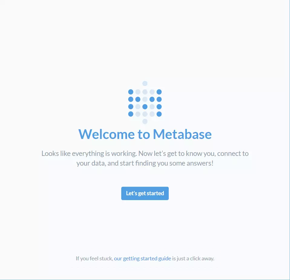当Metabase启动成功后,在浏览器中输入 http://127.0.0.1:3000/,则会看到欢迎界面。如下图:
