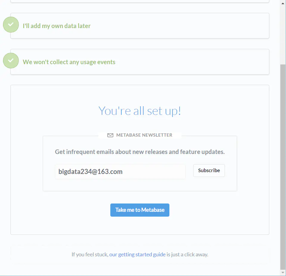 此步骤中,你可以通过Email订阅的方式,获取Metabase最新的版本更新信息。也可以不做选择,直接点击Take me to Metabase。如下图: