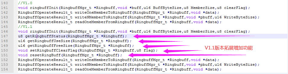 从上图可见,从V1.0到V1.1,仅仅是增加了功能。对曾经引用V1.0版本“环形缓存”模块的应用可以从容切换到V1.1版本,并且可以不理会新增功能的情况下正常运行。