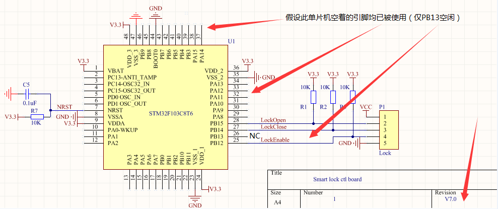 首先以一个电路图说明“开闭原则”的例子(在此假设读者具备一定原理图知识)背景假设:此图是一个智能锁的原理图,目前此图版本:V7.0。如下图所示:
