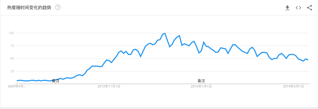 两个重要阶段是指过高期望的峰值和泡沫化的底谷期 。现在正处于稳步向前发展的阶段。我们可以从 googletrend 上 big data 的曲线就能印证。大数据大约从 2009 年开始走向人们的视野,在 2015 年左右走向了顶峰,然后慢慢走向下降通道(当然这张曲线并不会和上面这张技术成熟度曲线完全拟合,比如技术曲线处在下降通道有可能会使讨论这项技术的搜索量增加)。