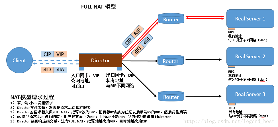 调度器重写请求报文的目标地址,根据预设的调度算法,将请求分派给后端的真实服务器;真实服务器的响应报文通过调度器时,报文的源地址被重写,再返回给客户,完成整个负载调度过程。要求负载均衡需要以网关的形式存在于网络中。