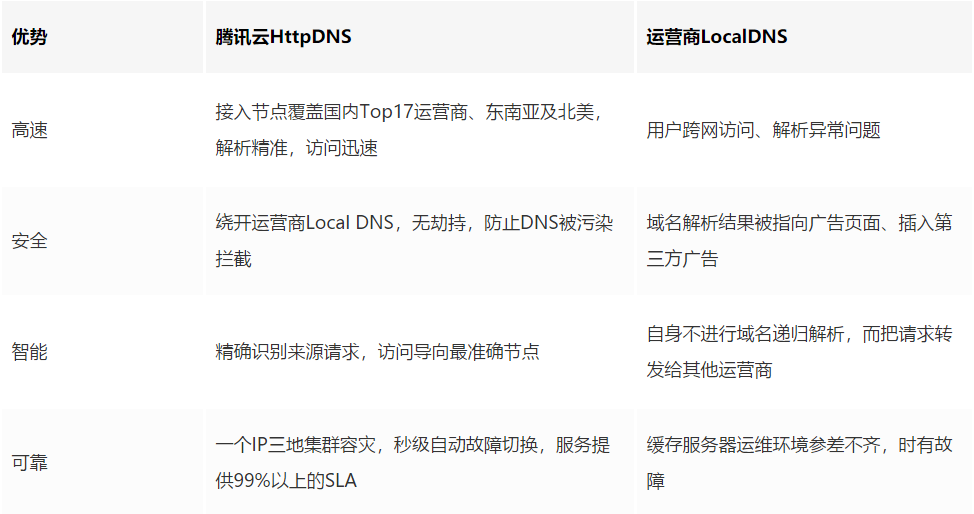 以腾讯云 HttpDNS 为参考,相较于传统 LocalDNS 的优势对比: