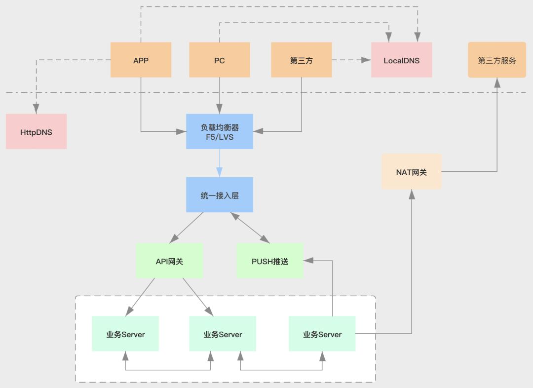 业务 Server 之间通过专有的 RPC 协议实现相互调用,并通过 NAT 网关调用外部第三方服务。
