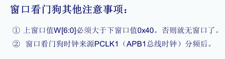 窗口看门狗需要注意的事项为:1.上限值大于下限值 2.采用时钟源不同
