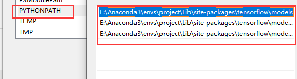 1.新建PYTHONPATH系统变量,将models、models\research、models\research\slim的路径添加到PYTHONPATH中去,我的如下: