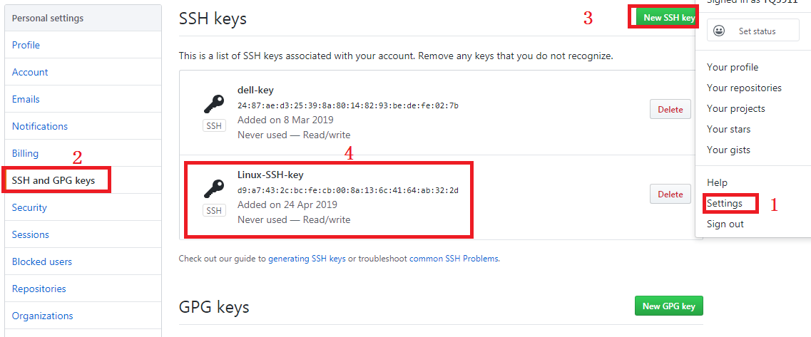 4.在github上创建新的SSH Key,title可以随便写,Key内容为上面产生的长串字符串,如图2