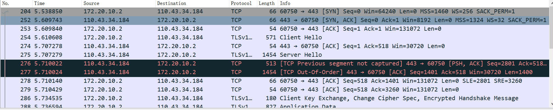我们清晰的可以看到在前面三个报文段中,第一个有SYN标记,是客户端发来的第一次握手,第二次是服务器返回的SYN+ACK报文段,也就是第二次握手过程。第三次是一个客户端返回的ACK。