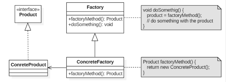 下图中,Factory 有一个 doSomething() 方法,这个方法需要用到一个产品对象,这个产品对象由 factoryMethod() 方法创建。该方法是抽象的,需要由子类去实现。