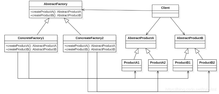 至于创建对象的家族这一概念是在 Client 体现,Client 要通过 AbstractFactory 同时调用两个方法来创建出两个对象,在这里这两个对象就有很大的相关性,Client 需要同时创建出这两个对象。
