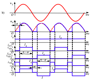 单相桥式半控整流电路,有续流二极管,阻感负载时的波形