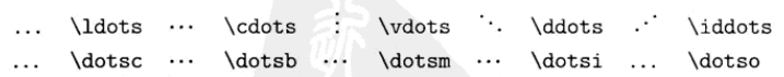 还有跨多行的省略号 \hdotsfor{<列数>}, 反向斜省略号\iddots, 方便排版一些矩阵