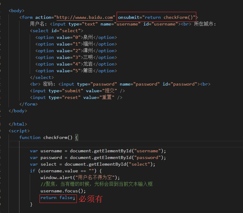2.一般表单校验的事件,都会用form的onsubmit事件配套提交按钮(type="submit")
