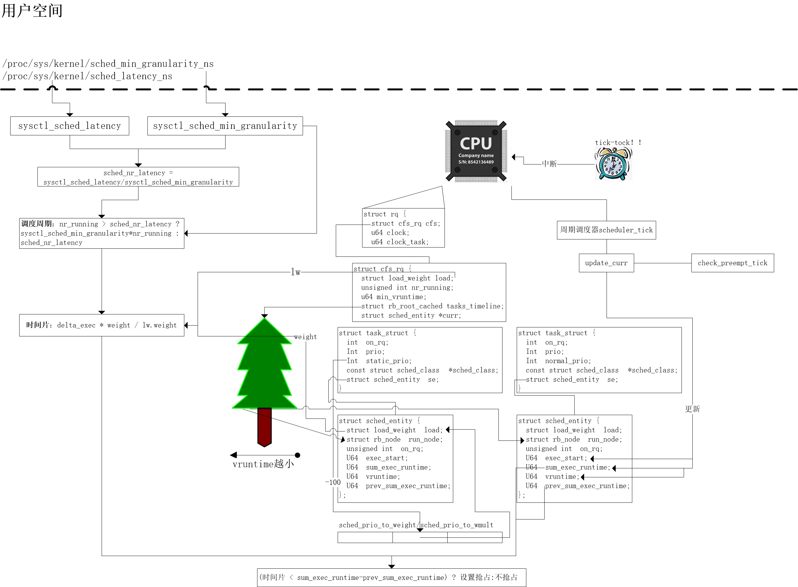 但是vruntime和wall-time是不相等的,还要通过优先级加权,也就是说同样运行了10ms,高优先级进程vruntime+1低优先级进程可能要+10。