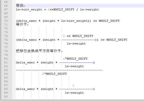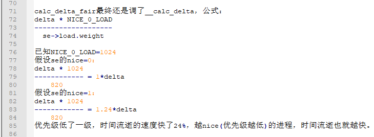 最后调用__calc_delta算出se分得的时间,__calc_delta的实现很复杂但是注释写的很清楚,返回值有两种情况: