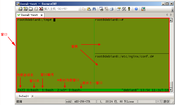 tmux的结构包括会话(session)、窗口(window)、窗格(pane)三部分,会话实质是伪终端的集合,每个窗格表示一个伪终端,多个窗格展现在一个屏幕上,这一屏幕就叫窗口。基本结构及状态信息如下图所示: