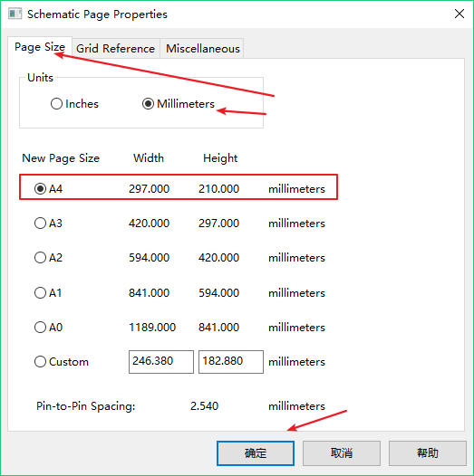 在Schematic Page Properties设置中第一个选项栏即可修改原理图Page的大小,在Units一栏可以切换单位,这里我选择mm: