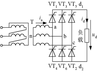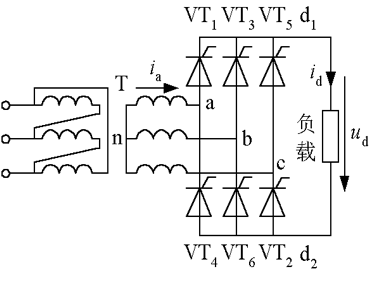 ◆共阴极组中与a,b,c三相电源相接的3个晶闸管分别为VT1,VT3,VT5,共阳极组中与a,b,c三相电源相接的3个晶闸管分别为VT4,VT6,VT2。