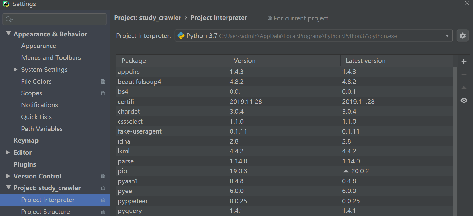 下载需要的requests-html库,pycharm选择左上角的 File->Settings,选择Project Interpreter(我的已经安装过了,所以会显示很多库,正常安装完python只有两个库)
