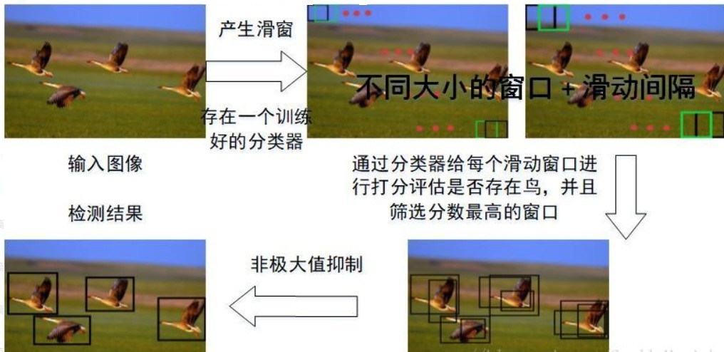 首先对输入图像进行不同窗口大小的滑窗进行从左往右、从上到下的滑动。每次滑动时候对当前窗口执行分类器(分类器是事先训练好的)。如果当前窗口得到较高的分类概率,则认为检测到了物体。对每个不同窗口大小的滑窗都进行检测后,会得到不同窗口检测到的物体标记,这些窗口大小会存在重复较高的部分,最后采用非极大值抑制(Non-Maximum Suppression, NMS)的方法进行筛选。最终,经过NMS筛选后获得检测到的物体。