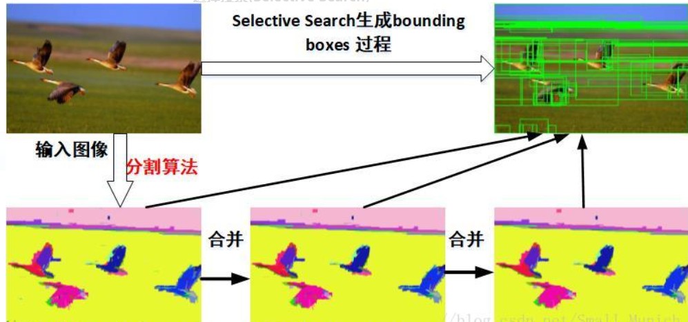 图像中物体可能存在的区域应该是有某些相似性或者连续性区域的。因此,选择搜索基于上面这一想法采用子区域合并的方法进行提取bounding boxes候选边界框。首先,对输入图像进行分割算法产生许多小的子区域。其次,根据这些子区域之间相似性(相似性标准主要有颜色、纹理、大小等等)进行区域合并,不断的进行区域迭代合并。每次迭代过程中对这些合并的子区域做bounding boxes(外切矩形),这些子区域外切矩形就是通常所说的候选框。