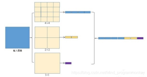 Spatial Pyramid Pooling层,对卷积特征图像进行空间金字塔采样获得固定长度的输出,可对特征层任意长宽比和尺度区域进行特征提取。具体做法是对特征图像区域进行固定数量的网格划分,对不同宽高的图像,每个网格的高度和宽度是不规定的,但对划分的每个网格进行池化,这样就可以得到固定长度的输出。SPP操作示意图:
