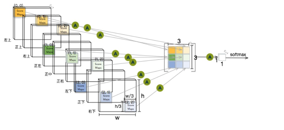 该层的大小和ResNet-101最后一层的大小相同,维度是k^2×(C+1)。C+1C+1为类别数,表示CC类物体加上1类背景。k是一个超参数,表示把ROI划分grid的单位,一般情况下,k=3。在R-FCN中,一个ROI区域会被等比例划分成一个k×k的grid,每个位置为一个bin,分别表示该grid对应的物体的敏感位置(左上,正上,右上,正左,正中,正右,左下,正下,右下)编码。