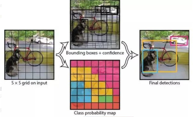 - 2.对于上述每个栅格,每个栅格预测两个bounding boxe以及栅格含有对象的置信度,同时每个栅格还会预测栅格所属对象类别。