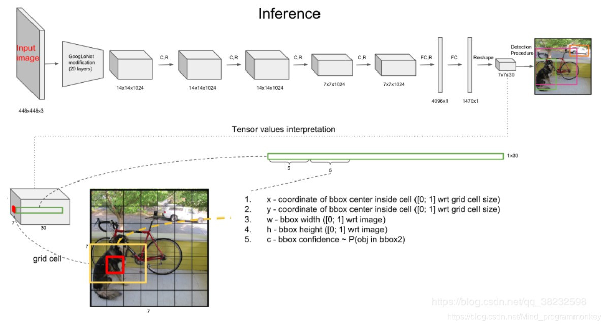 YOLOv1由24层卷积层,4个最大池化层和2个全连接层组成。我们关注最后的输出是7x7x30,这里是7x7代表输入图像的7x7栅格,一一对应,30的前十个代表2个bounding boxes的坐标以及对象的置信度,后20个代表VOC数据集的20个类别。