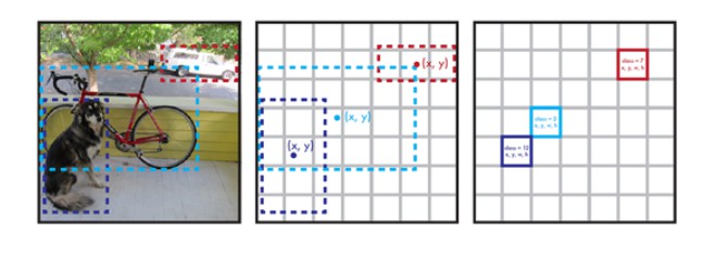YOLOv1是一个监督式的网络,有监督那就有标签,来看看标签是怎样定义,首先看狗,它被一个框框起来了,这个框就是真实的标签,框对应的中心在哪个栅格,就代表当前栅格是狗所在的栅格,这个栅格里就会记录狗的标签信息,自行车和小车和狗类似。