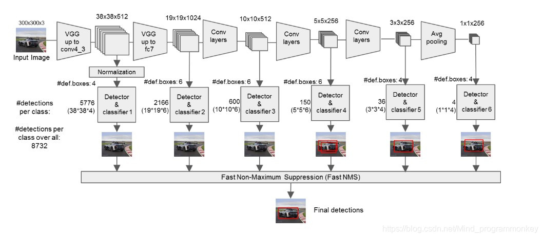 和yolo的筛选层基本一致,同样先过滤掉类别概率低于阈值的default box,再采用NMS非极大值抑制,筛掉重叠度较高的。只不过SSD综合了各个不同feature map上的目标检测输出的default box。