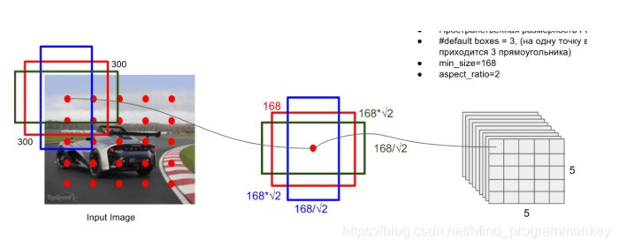 和faster R-CNN相似,SSD也提出了anchor的概念。卷积输出的feature map,每个点对应为原图的一个区域的中心点。以这个点为中心,构造出6个宽高比例不同,大小不同的anchor(SSD中称为default box)。每个anchor对应4个位置参数(x,y,w,h)和21个类别概率(voc训练集为20分类问题,在加上anchor是否为背景,共21分类)。如下图所示