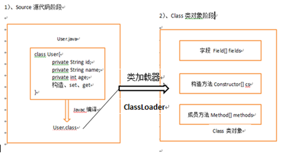 .java源文件通过javac编译成.class字节码文件之后,结构不变,还是存储在硬盘中,字节码文件通过一个叫类加载器的东西,将类加载到内存当中去。类加载器中有一个class对象,封装了类的基本信息,包括属性、构造方法、普通方法。