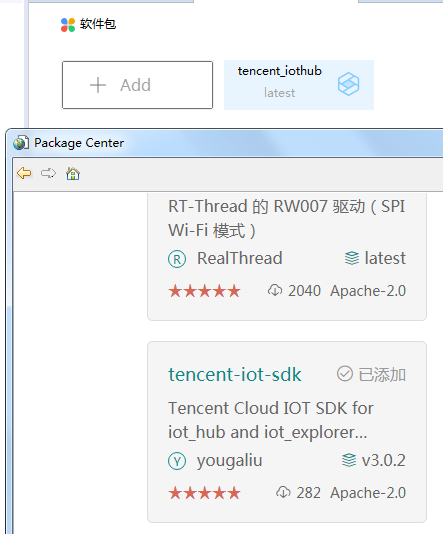 经笔者实际体验在RT-Thread Studio中添加腾讯云的连接支持只需要在Package Center选择对应的程序包即可,感觉此Package Center已经具备了物联网应用商店的雏形,这其实也体现了物联网生态建立会是大势所趋。