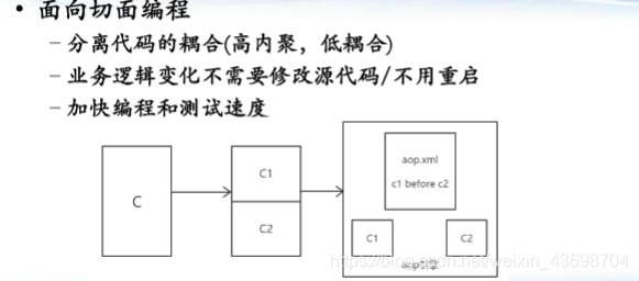 解释:本来c1和c2函数是耦合的,c1需要在c2前执行,而面向切面编程则将c1和c2分离,并且设置aop.xml配置文件,在配置文件中规定c2执行前必须执行c1,这样的化就降低了耦合,并且如果后续代码需要改变时,只需要添加代码,修改aop.xml配置文件即可。