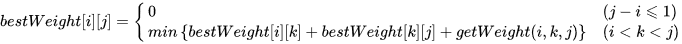 bestWeight[i][j] = bestWeight[i][k] + bestWeight[k][j] + getWeight(i, k, j);//记录第一个基准值