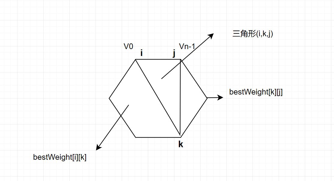 bestWeight[ i ] [ j ] =m 表示它的一个子多边形{Vi , Vi+1 , ... , Vj-1 , Vj}的最优解=m (所以最终解为bsetWeight[ 0 ][ n-1 ])
