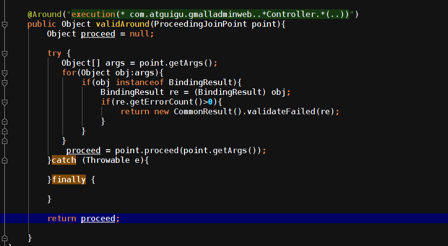这里想利用aop完成统一的数据校验,所以用环绕通知合适(因为要返回给前端无论成功与否),aop类代码如下: